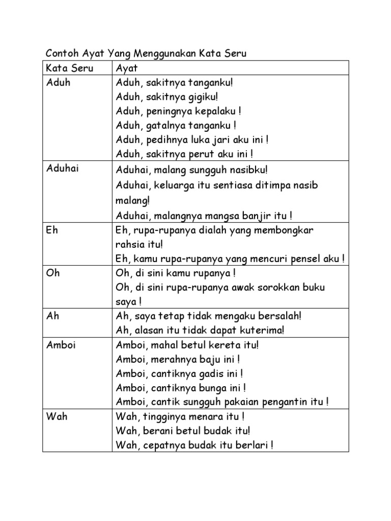 Ayat seruan ialah ayat yang digunakan untuk melahirkan perasaan seperti takut marah gembira sakit benci dan sebagainya. Kata seru merupakan kata tugas yang digunakan untuk membentuk ayat seruan dan setiap ayat seruan akan berakhir dengan tanda seru. Syabas kamu telah telah terpilih untuk.